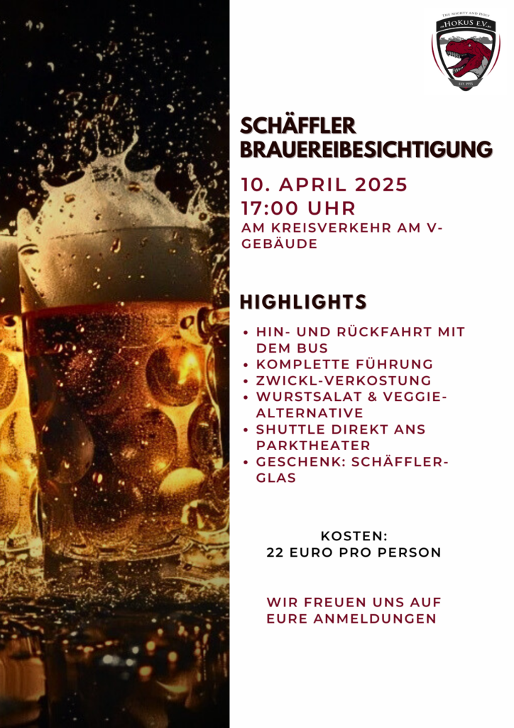 Am Donnerstag, den 27.03.2025, findet unsere traditionelle Kneipentour statt! Treffpunkt ist um 17:15 Uhr vor der BlackBox (Gebäude SV) der Hochschule. Bitte seid unbedingt